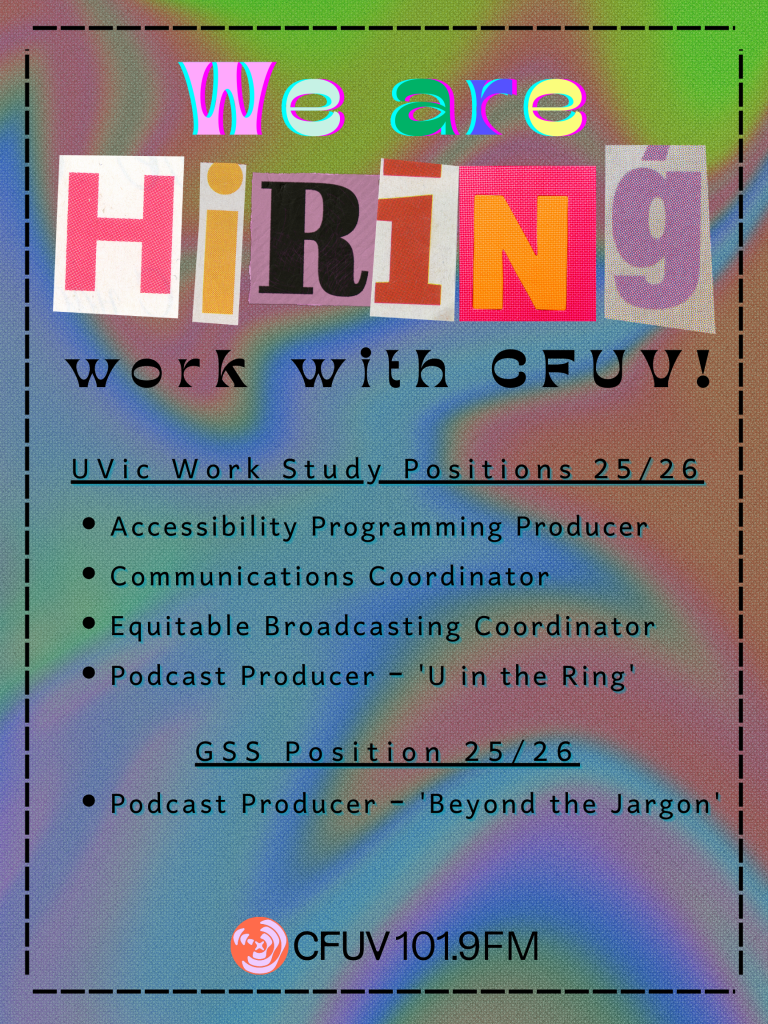 CFUV is hiring for the 2025/26 academic year! Click the image below to visit the Jobs page and find out more.